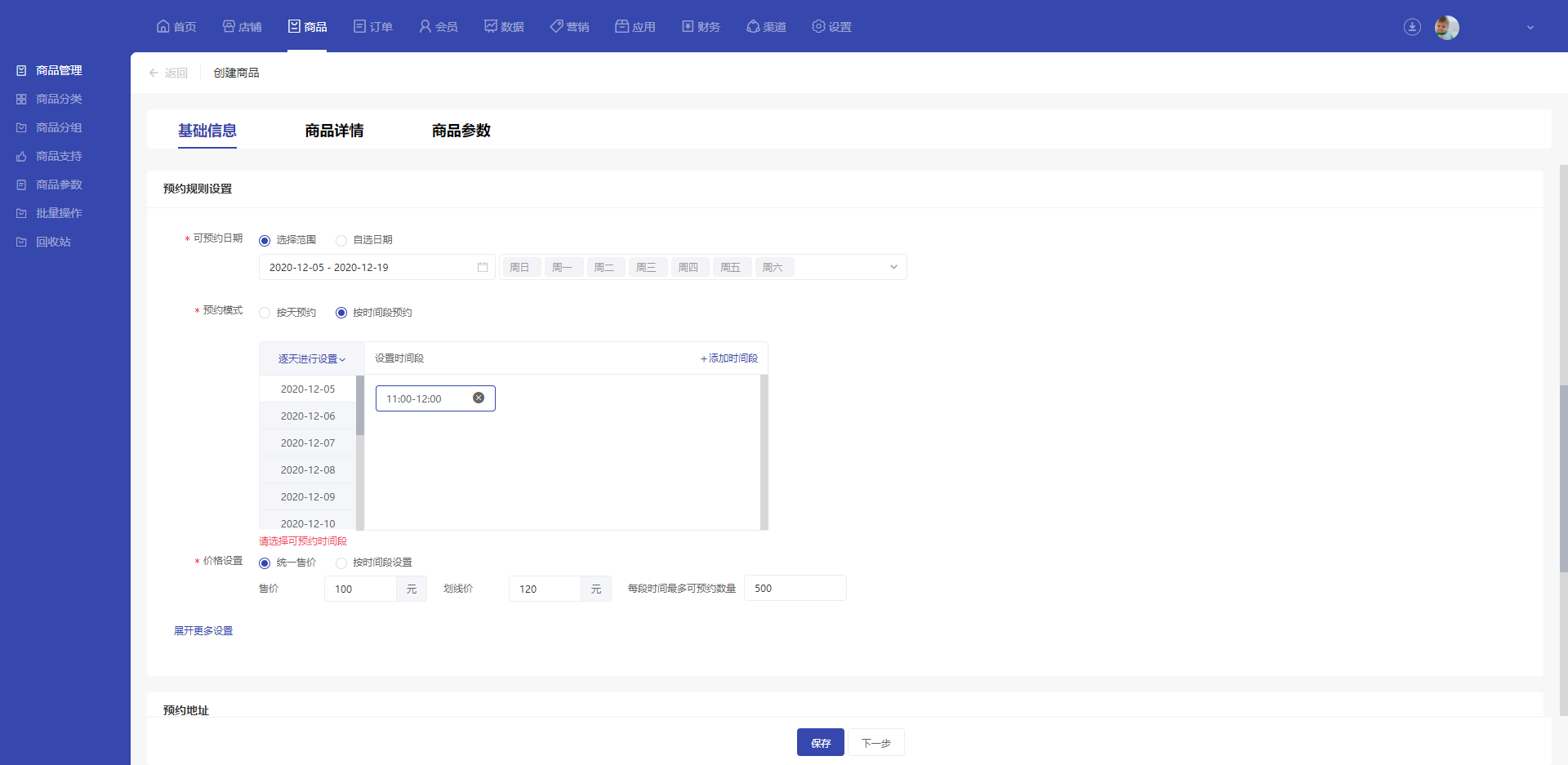 在预约规则设置中,必须配置该商品的可出售日期范围、预约模式、价格与预约数量,可以按天进行预约,也可以按每天的自定义时间段进行预约,每段时间的可预约数量和价格可以自定义。