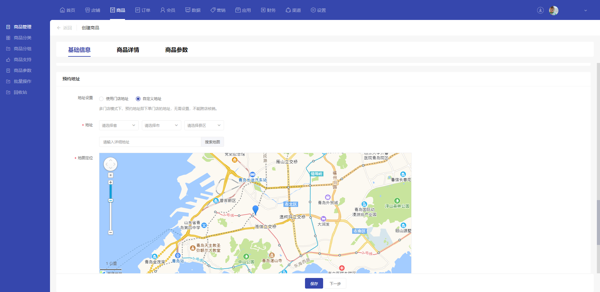 非多门店模式:此处可以选择设置中的门店列表,由用户自主选择预约目的地,也可以自定义设置一个地理位置,适用于景点门票销售。
