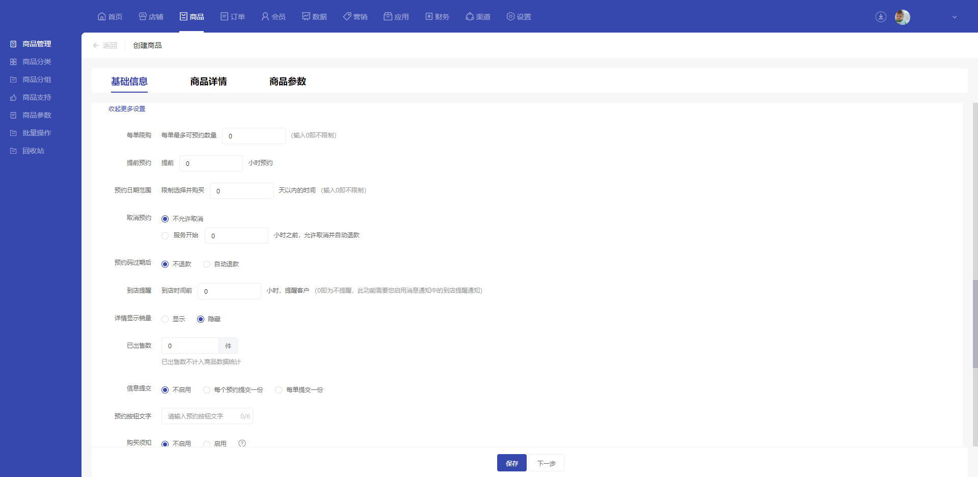 在预约规则设置模块这个,可以展开“更多设置”,根据商品的需求单独配置限购量、提前预约时间、是否允许取消预约、到店提醒等多项功能。